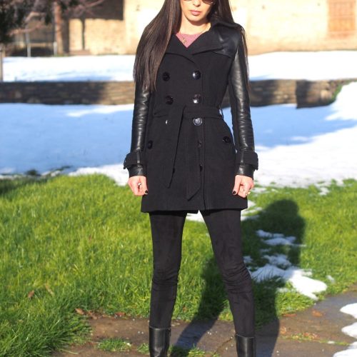 Extravagant Black Cashmeere Coat Women Leather Elegant Wool