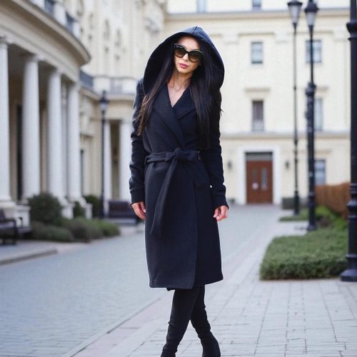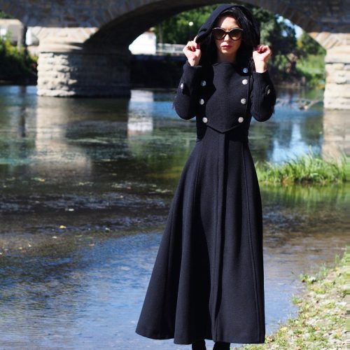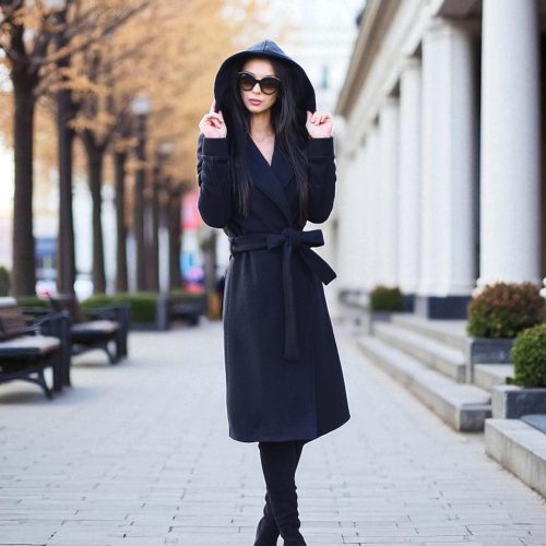 Long Cashmere Coat Wool Women Black Hooded Maxi