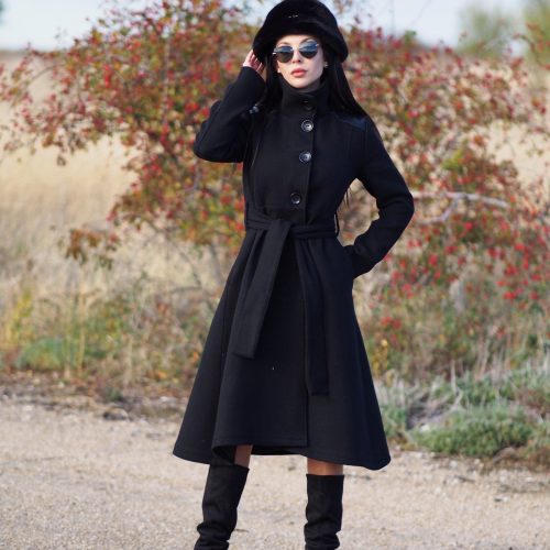 Elegant long black wool coat with genuine leather shoulder panels
