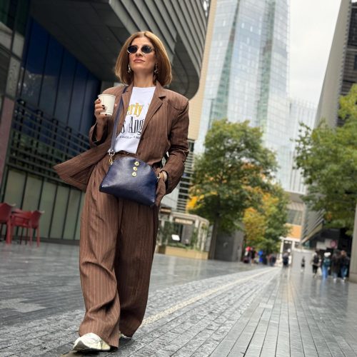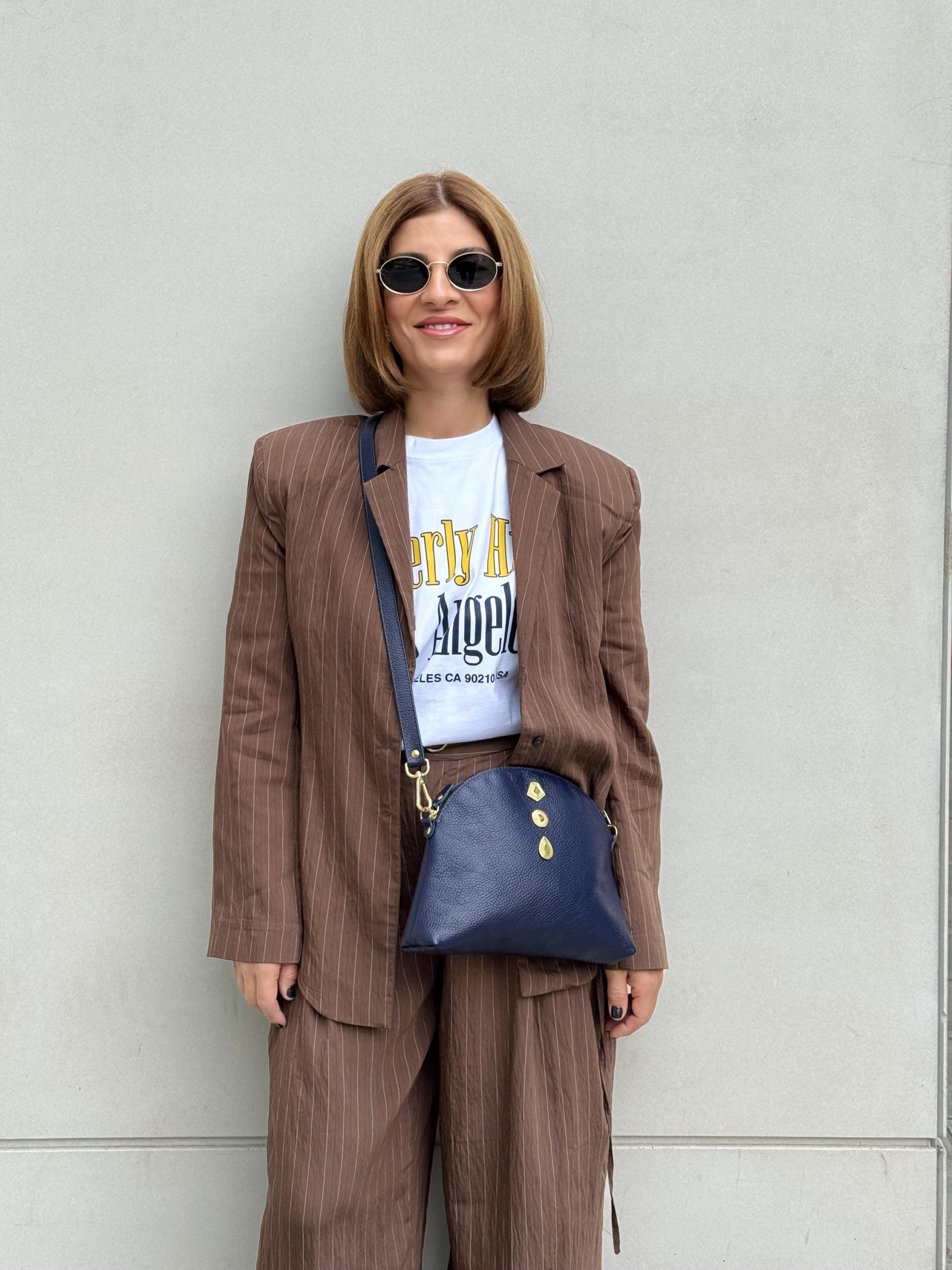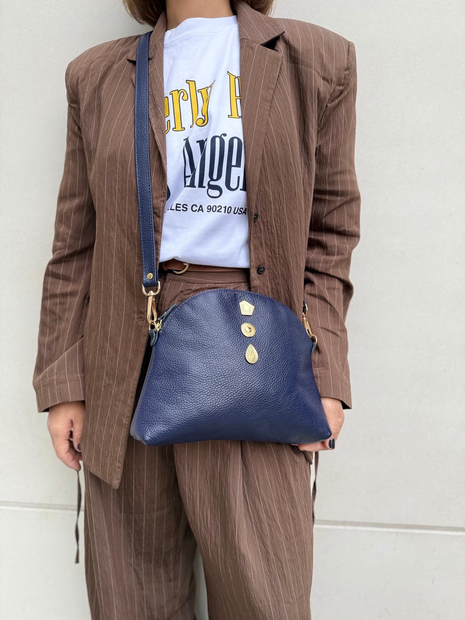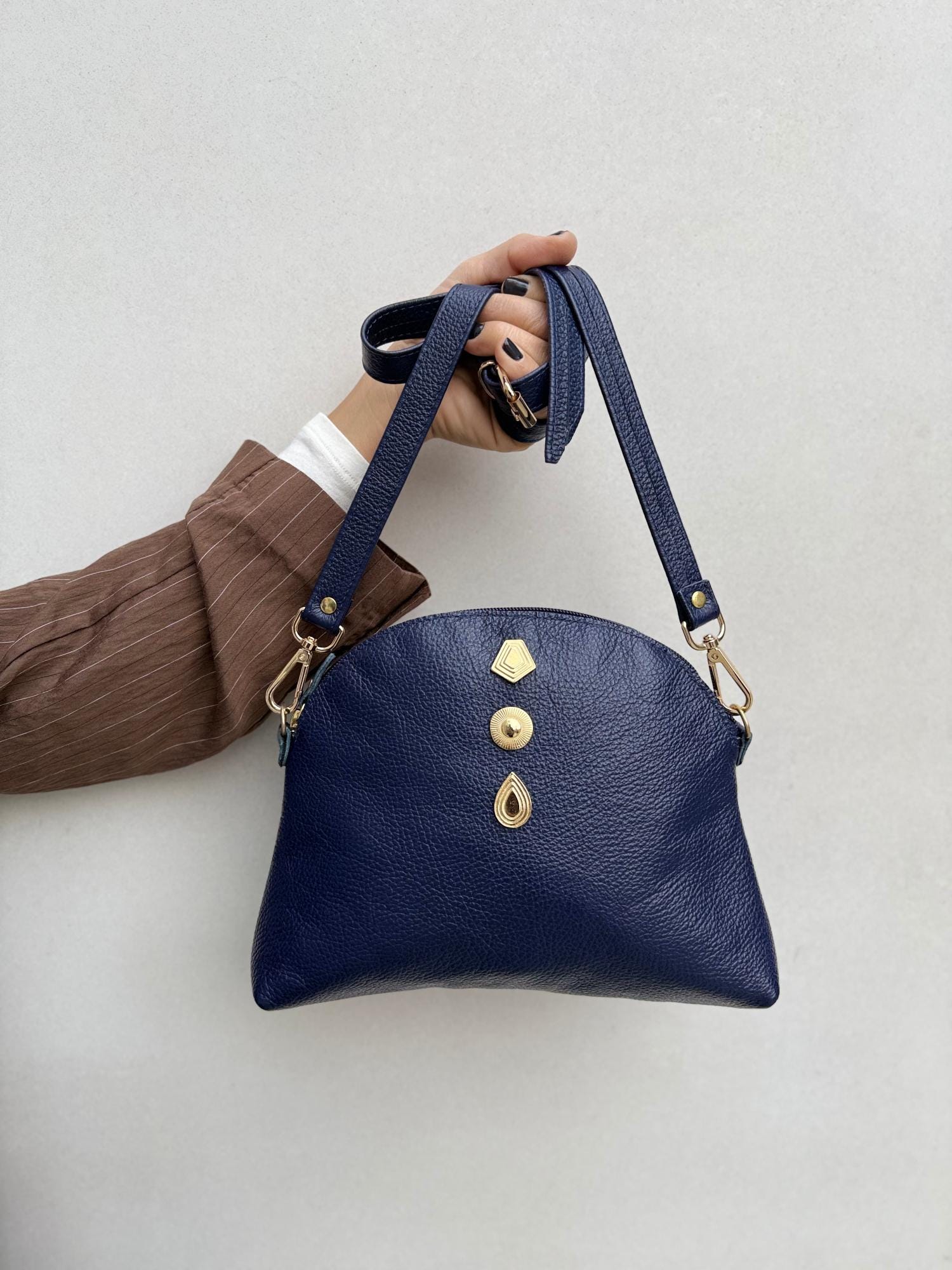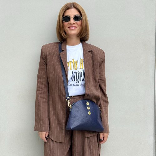 This handmade blue leather shoulder bag is crafted from premium full grain leather and decorated with gold zamak buckles. It features a large interior space, zipper closure, and removable adjustable strap. Elegant and minimal a timeless us design for everyday sophistication.