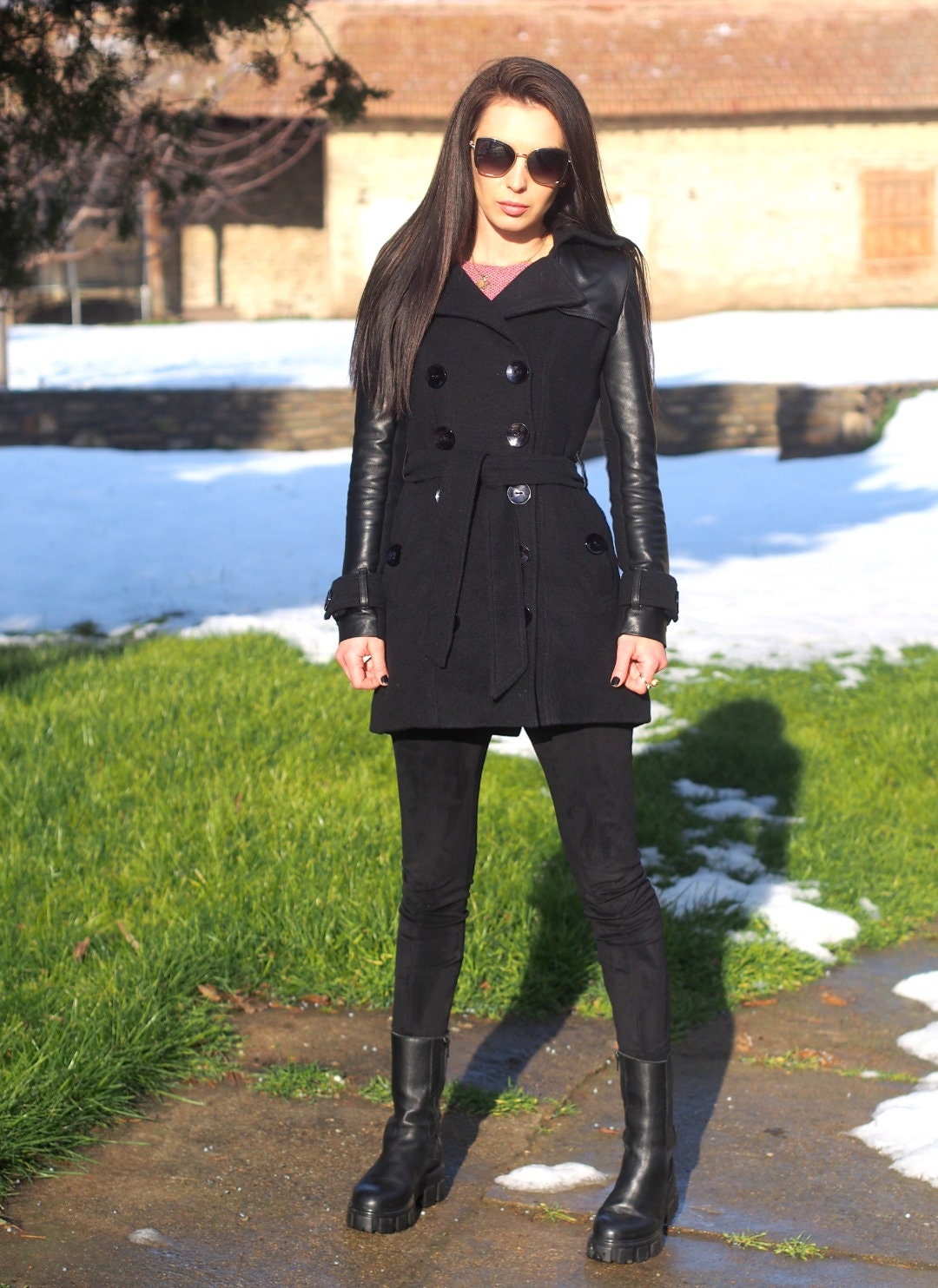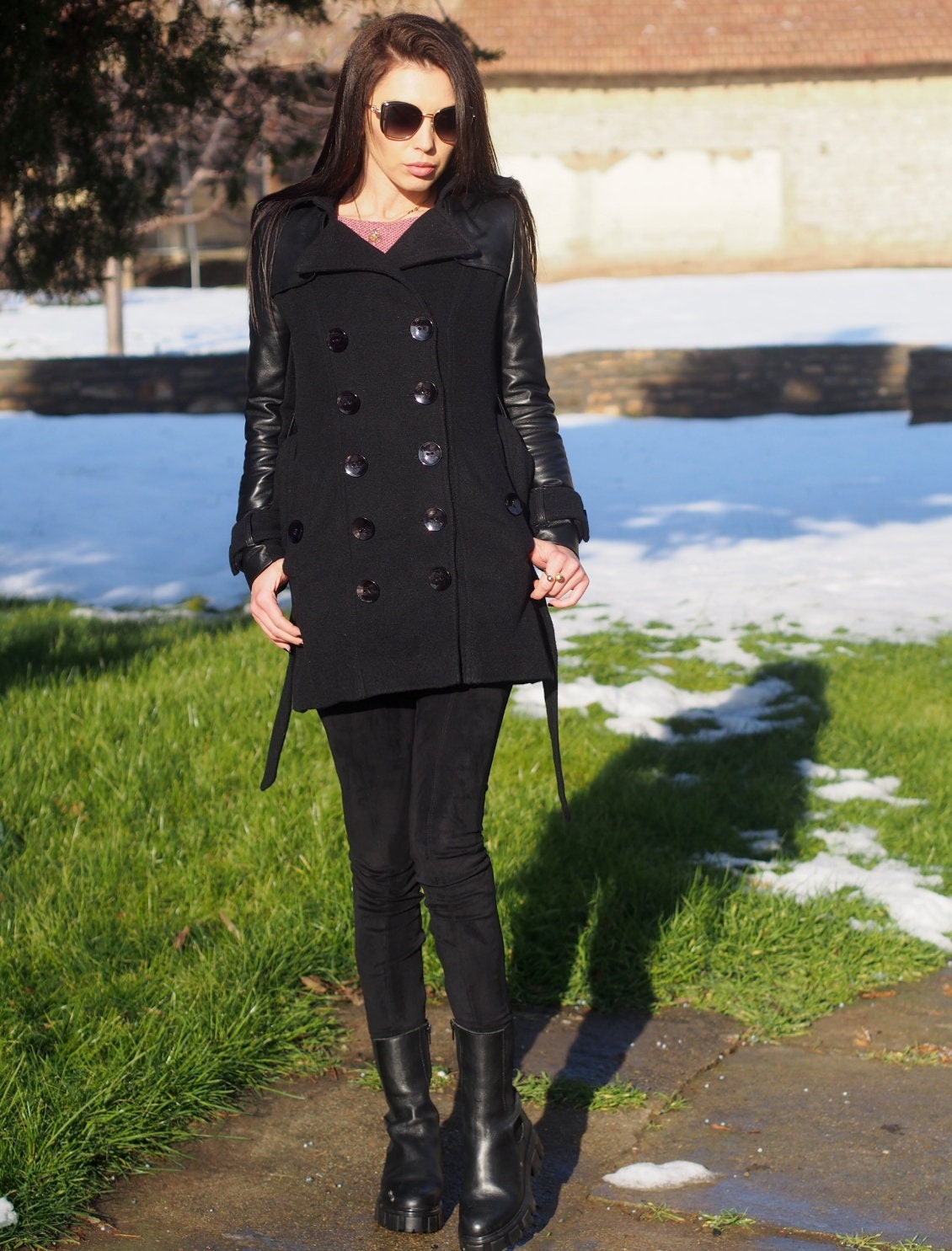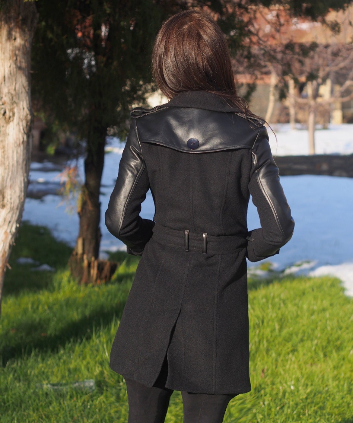 Extravagant Black Cashmeere Coat Women Leather Elegant Wool