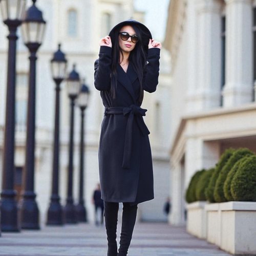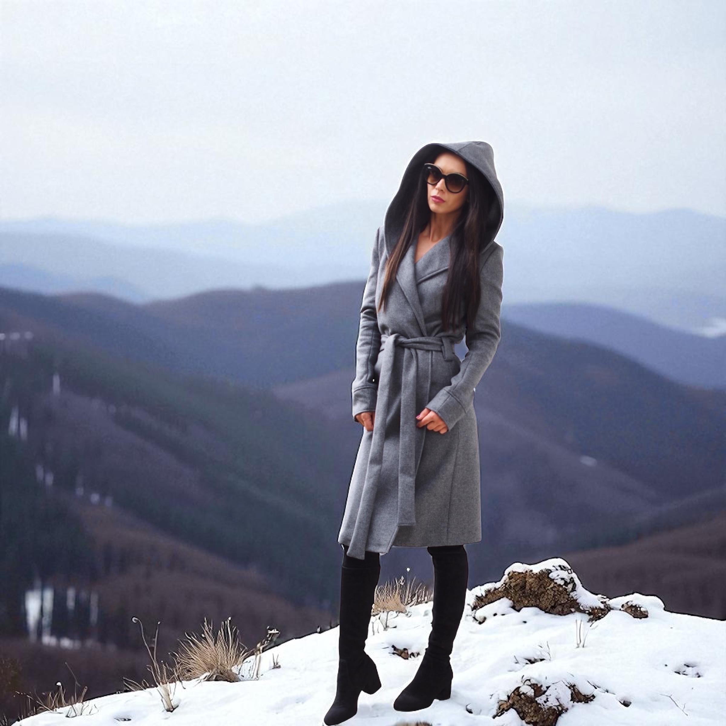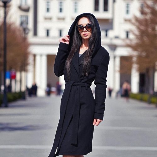 Long Cashmere Coat Wool Women Black Hooded Maxi