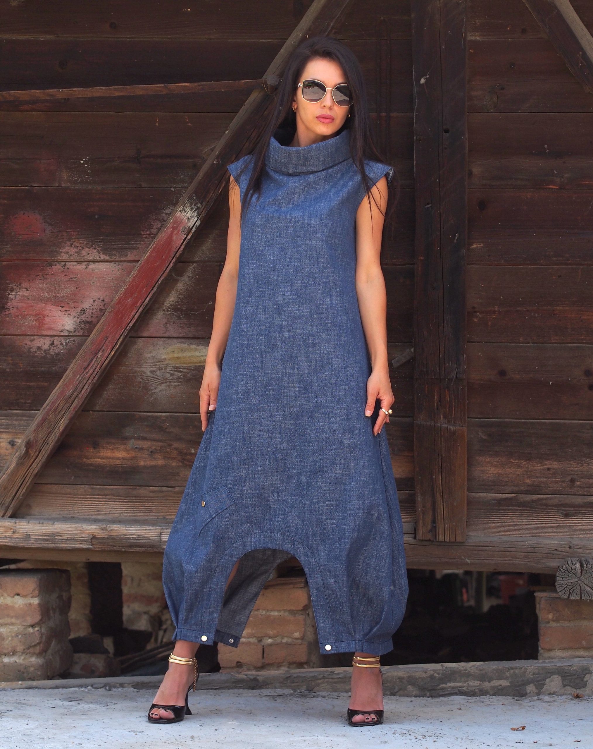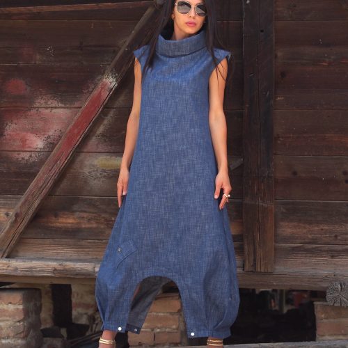 Step into artistic elegance with this sleeveless long denim dress, designed with an original drop crotch-style cut and tapered hem. A perfect blend of avant-garde fashion and everyday wearability, this dress is handmade from soft cotton denim for a breathable, durable feel.