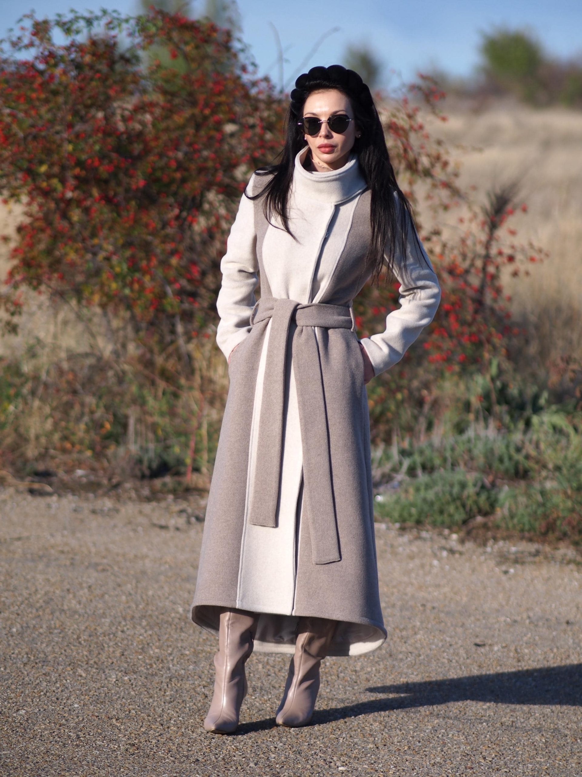 Featuring a graceful long silhouette, structured high collar, and a belted waist, this piece blends comfort, warmth, and modern design a true statement for the cold season.