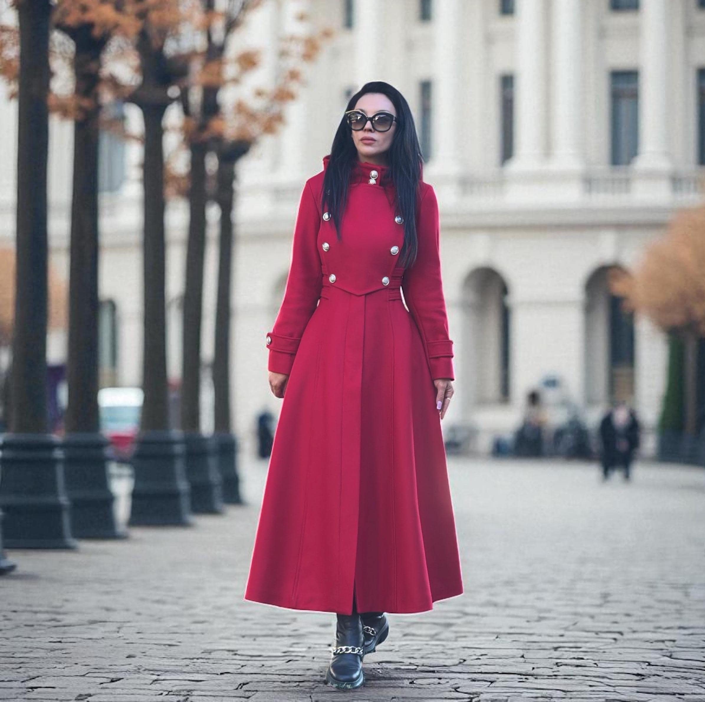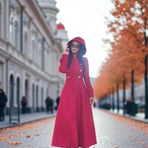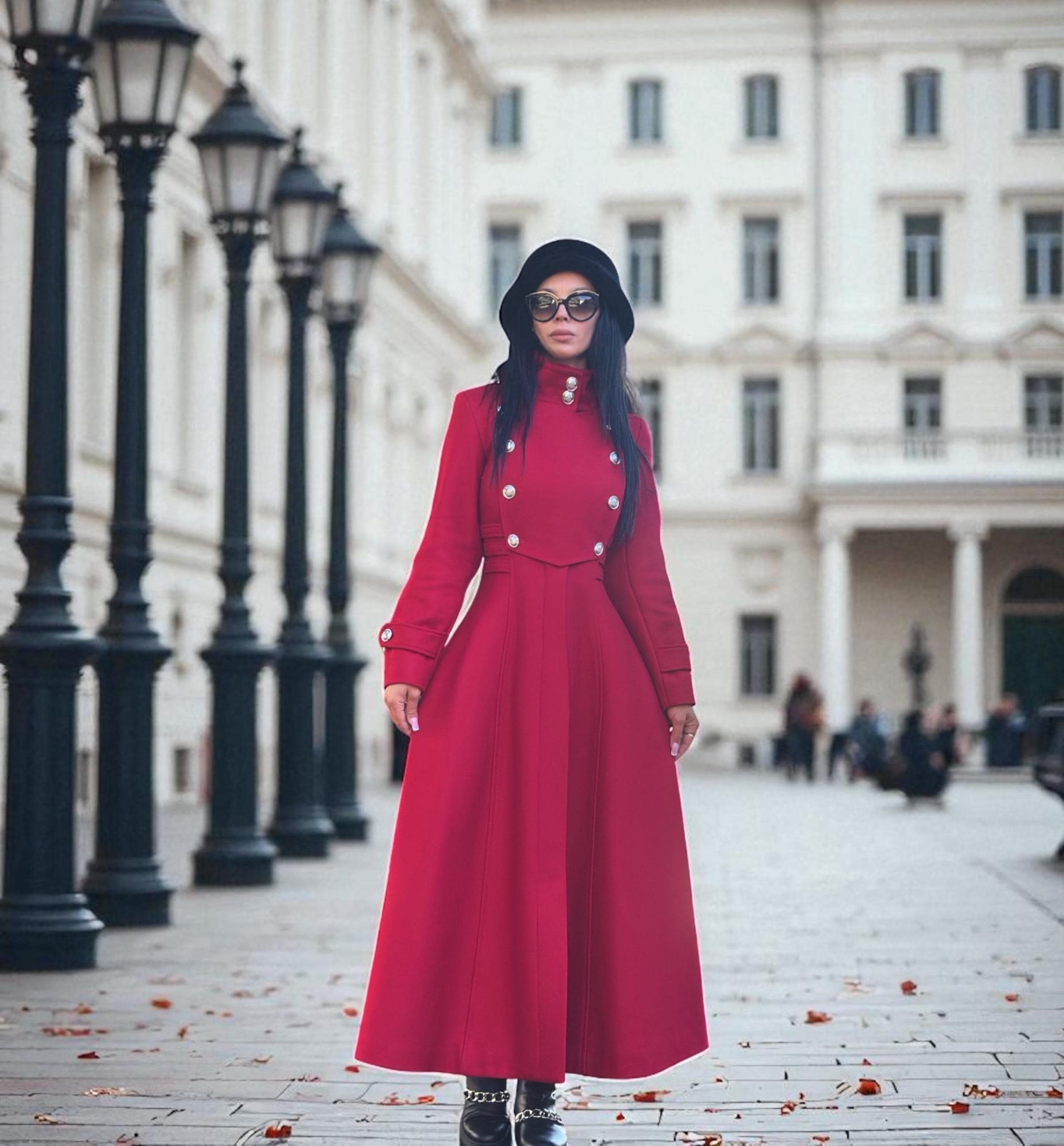 Step into timeless elegance with this stunning women s red wool coat. Designed for both style and warmth, this long maxi coat features a flattering tailored fit and a dramatic silhouette that makes a statement in any winter setting.
